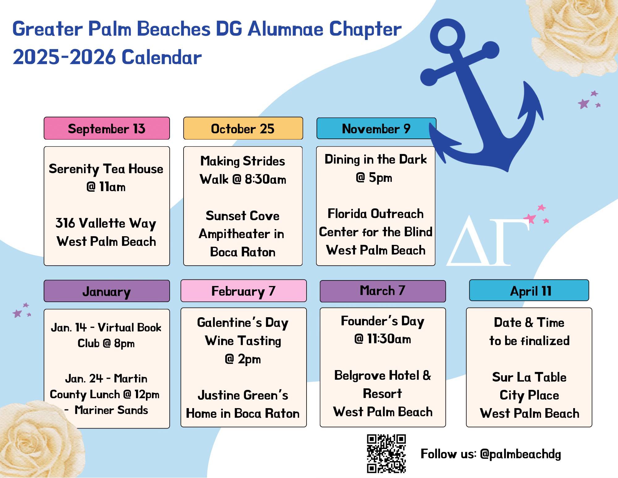 The Greater Palm Beaches Alumnae Chapter’s events center on the ideals that bind us together as Delta Gammas—fun, friendship, sisterhood, and “doing good.” Whether you have been actively involved for many years or are just renewing your commitment to Delta Gamma, we look forward to welcoming you at an upcoming event.